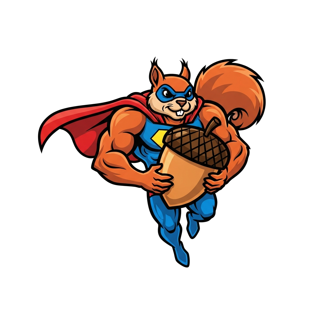 A superhero squirrel saving an acorn