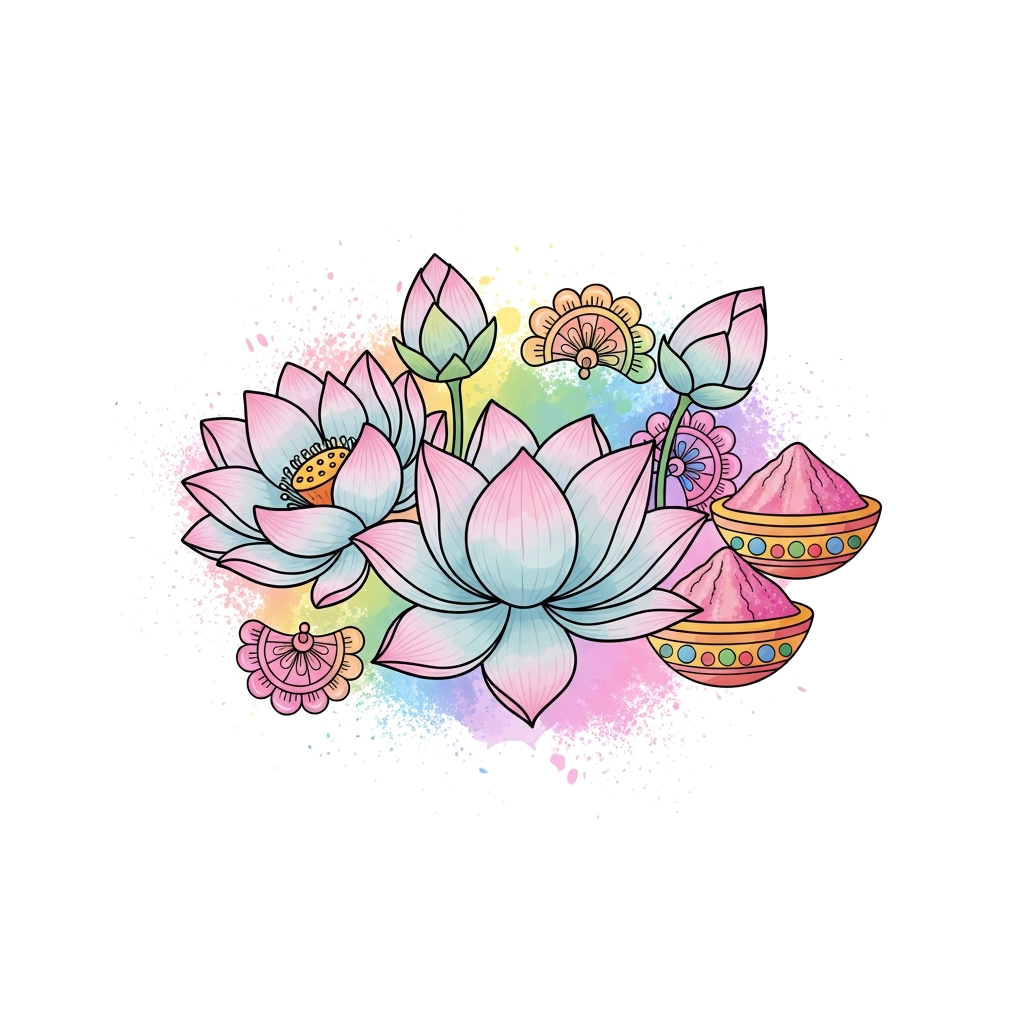 "A whimsical illustration of blooming lotus flowers and traditional Indian floral motifs in soft pastel shades, with a subtle rainbow gradient effect, surrounded by gentle splashes of powdered color (gulal), in a delicate watercolor style."