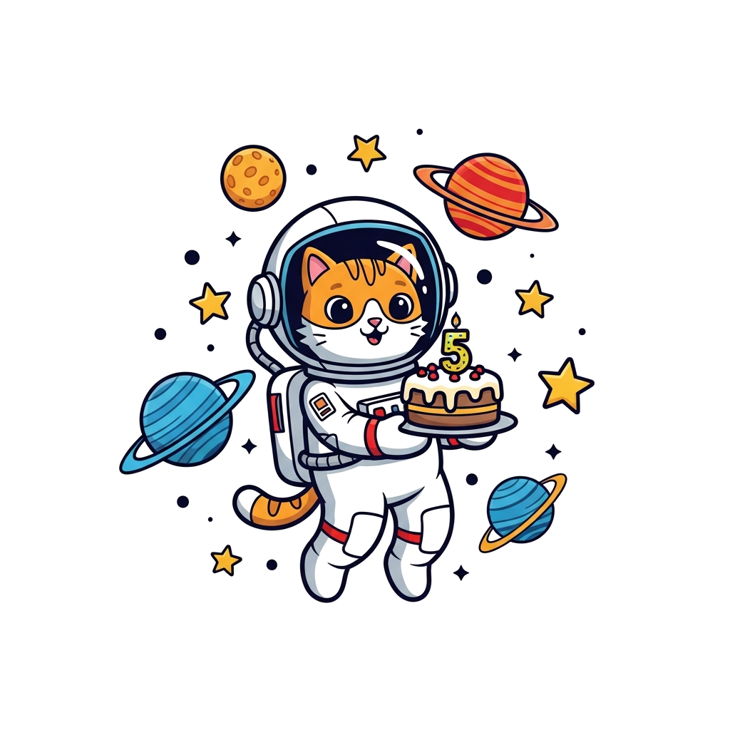 "A cute cartoon astronaut cat floating in space, holding a birthday cake with the number 5, surrounded by colorful planets and stars, vibrant and playful style."