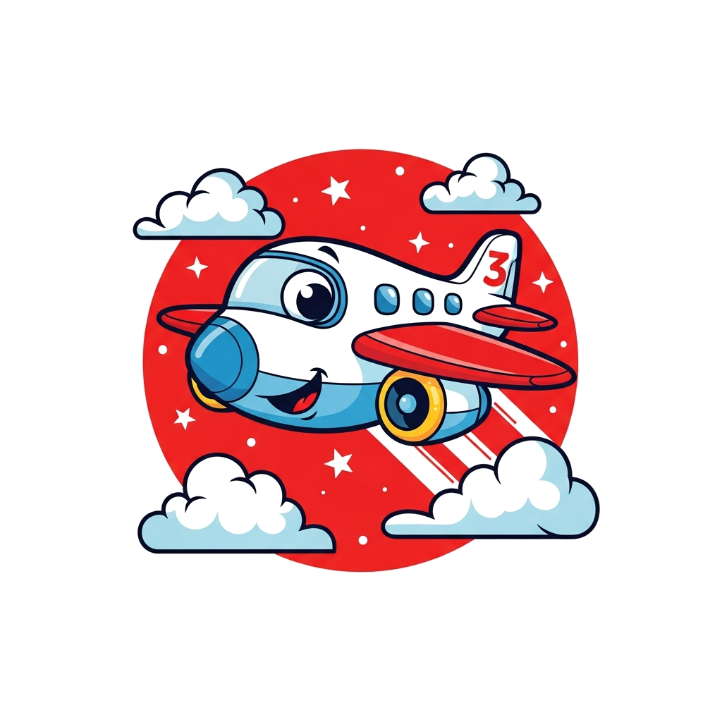 "A cheerful cartoon aeroplane with big friendly eyes and a smile, flying high in a bright red sky with fluffy white clouds and little stars, with the number '3' subtly incorporated into the aeroplane's design."
