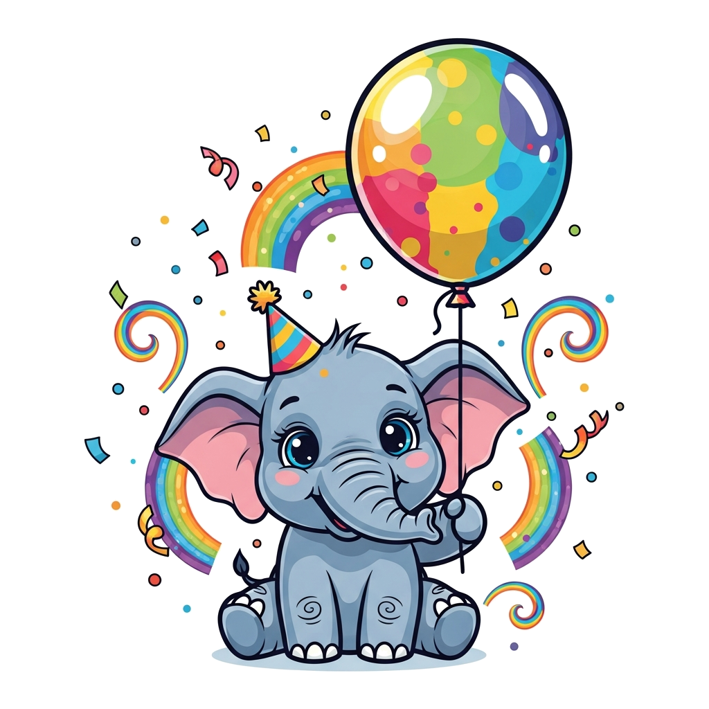 "A vibrant, cartoon-style illustration of a cheerful baby elephant with big, bright eyes, wearing a small party hat and holding a giant, colorful balloon. The background is filled with confetti and rainbow swirls."