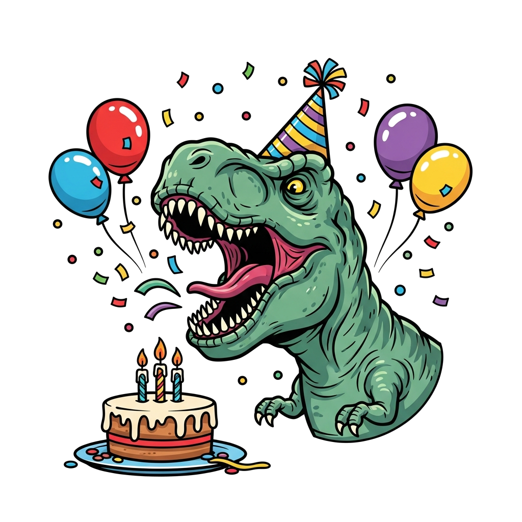 "A roaring T-Rex wearing a party hat and blowing out candles on a cake, with colorful confetti and balloons around it, vibrant cartoon style"
