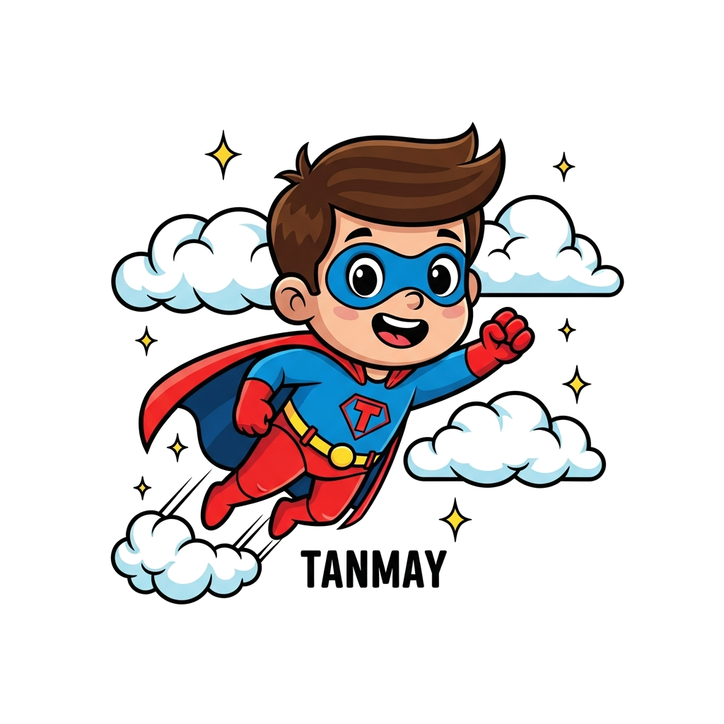 "A playful cartoon illustration of a little superhero named Tanmay, striking a heroic pose next to a giant, friendly comic book speech bubble that says 'POW!', with a cityscape silhouette in the background, in a soft, rounded art style."