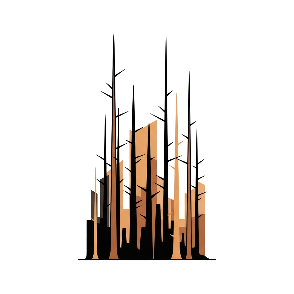 "A modern, abstract representation of a forest with tall, slender trees using geometric shapes and a limited, earthy color scheme, clean and sophisticated."