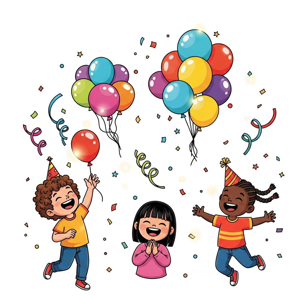 "A joyful scene with colorful balloons, floating confetti, and whimsical party streamers, featuring three happy cartoon children (diverse ethnicities) laughing and playing together, in a bright, festive, and slightly magical art style."