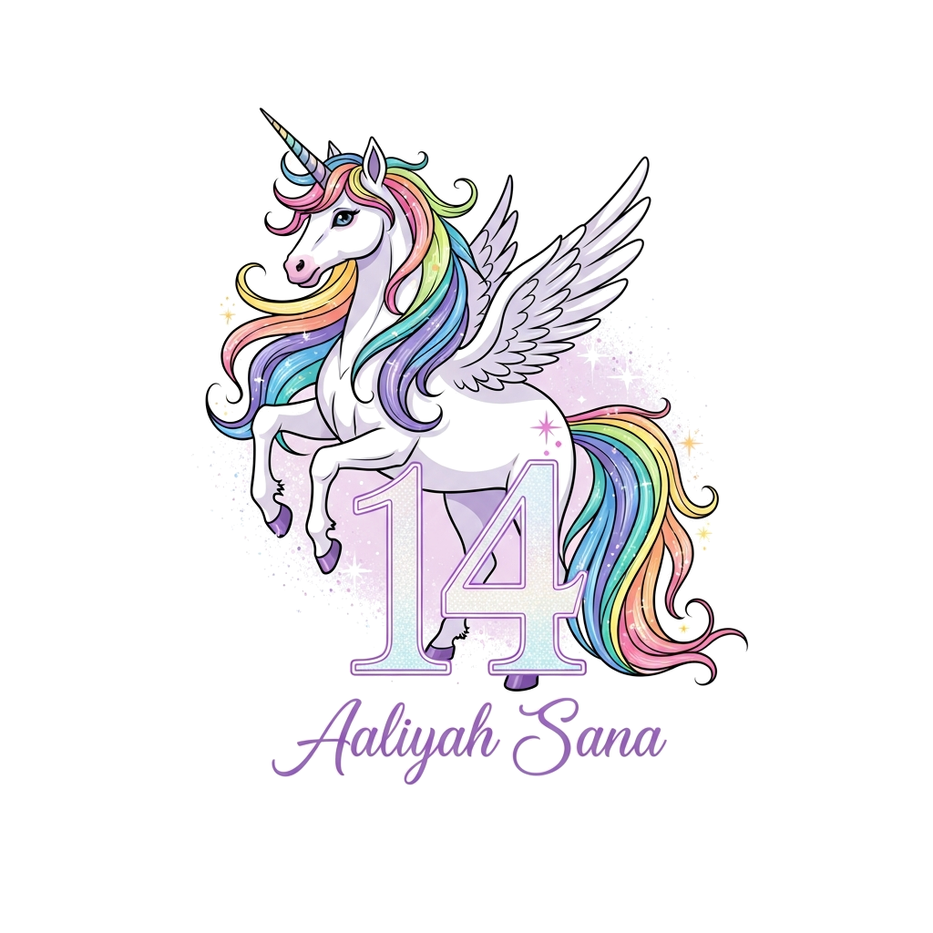 "An elegant, majestic unicorn illustration with a flowing, rainbow-hued mane and tail, subtle glitter and stardust effects, in a soft pastel color palette. The number '14' is subtly integrated into the design as a shimmering outline, with 'Aaliyah Sana' written in a graceful, ethereal script below. Dreamy, ethereal style."