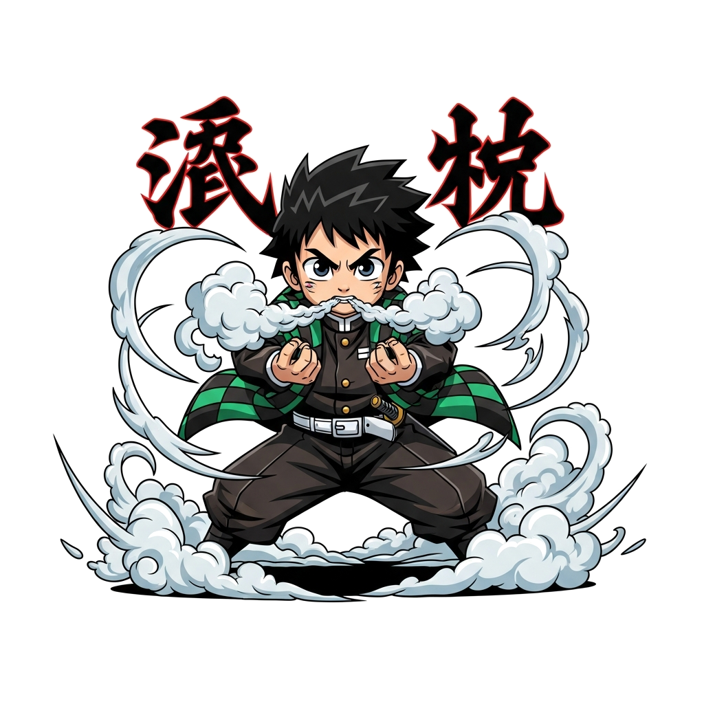 "A dynamic illustration of a young Muichiro Tokito in a powerful mist breathing stance, surrounded by swirling mist effects and sharp, stylized kanji, vibrant anime art style."
