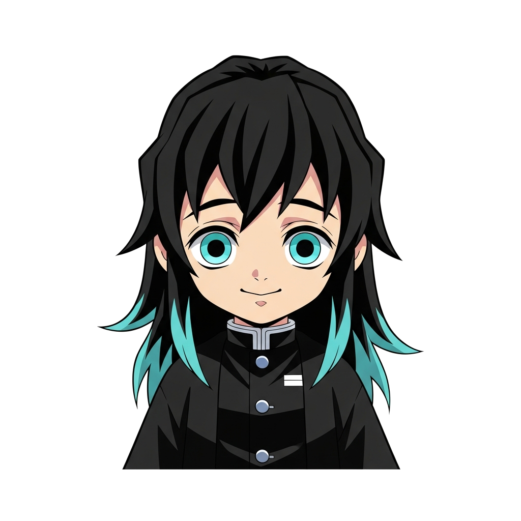 "Muichiro with Long black hair with two strands of hair having cyan colour on the ends on the back hair having the same colour on the ends of his hair. He should have light blue eyes or terquice colour eyes. He should look exactly like muichiro tokito from demon slayer kimitsu no yaiba. he should have sweet smile on his face . With straight hair no spikes. He should not have a coat expecialy not a white one . He should be wearing a black colour demon slayer uniform"