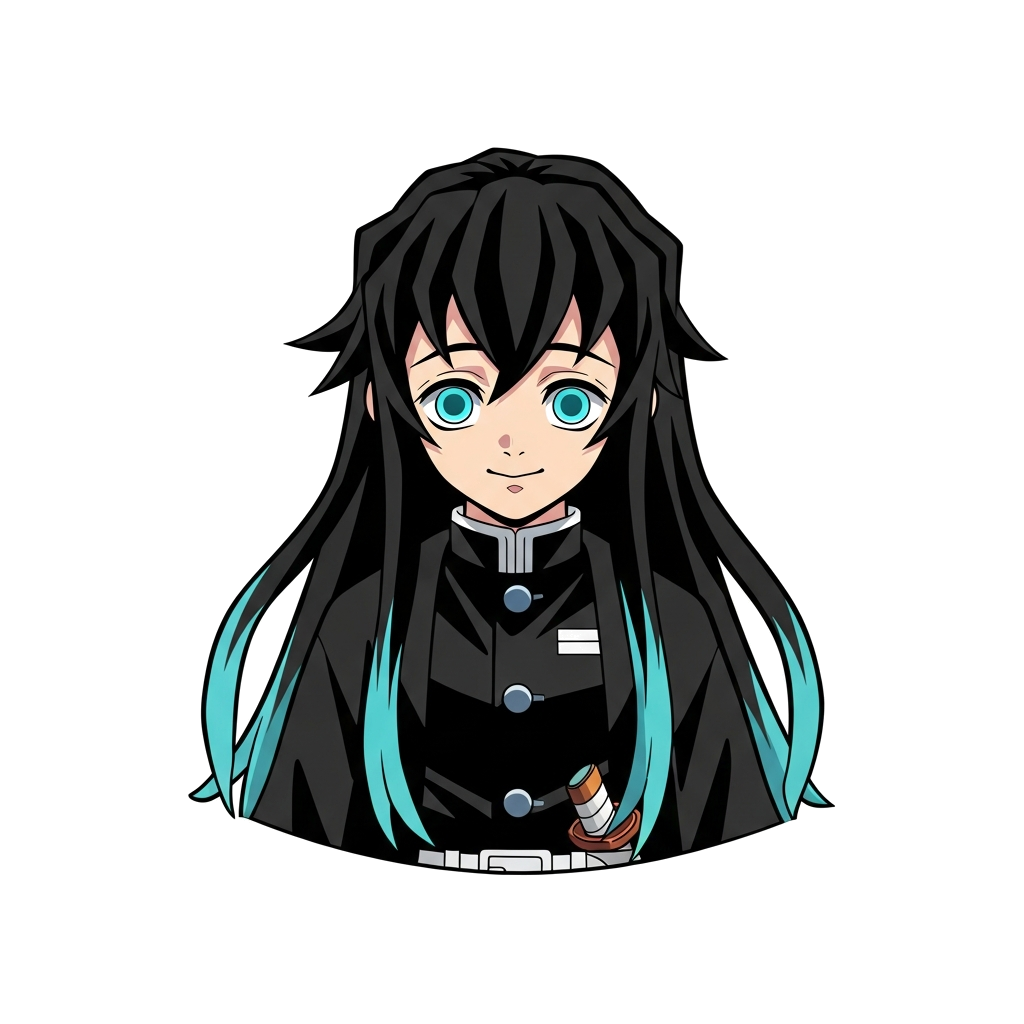 "Muichiro with Long black hair with two strands of hair having cyan colour on the ends on the back hair having the same colour on the ends of his hair. He should have light blue eyes or terquice colour eyes. He should look exactly like muichiro tokito from demon slayer kimitsu no yaiba. he should have sweet smile on his face . With straight hair no spikes. He should not have a coat expecialy not a white one . He should be wearing a black colour demon slayer uniform. His hair should touch the ground "