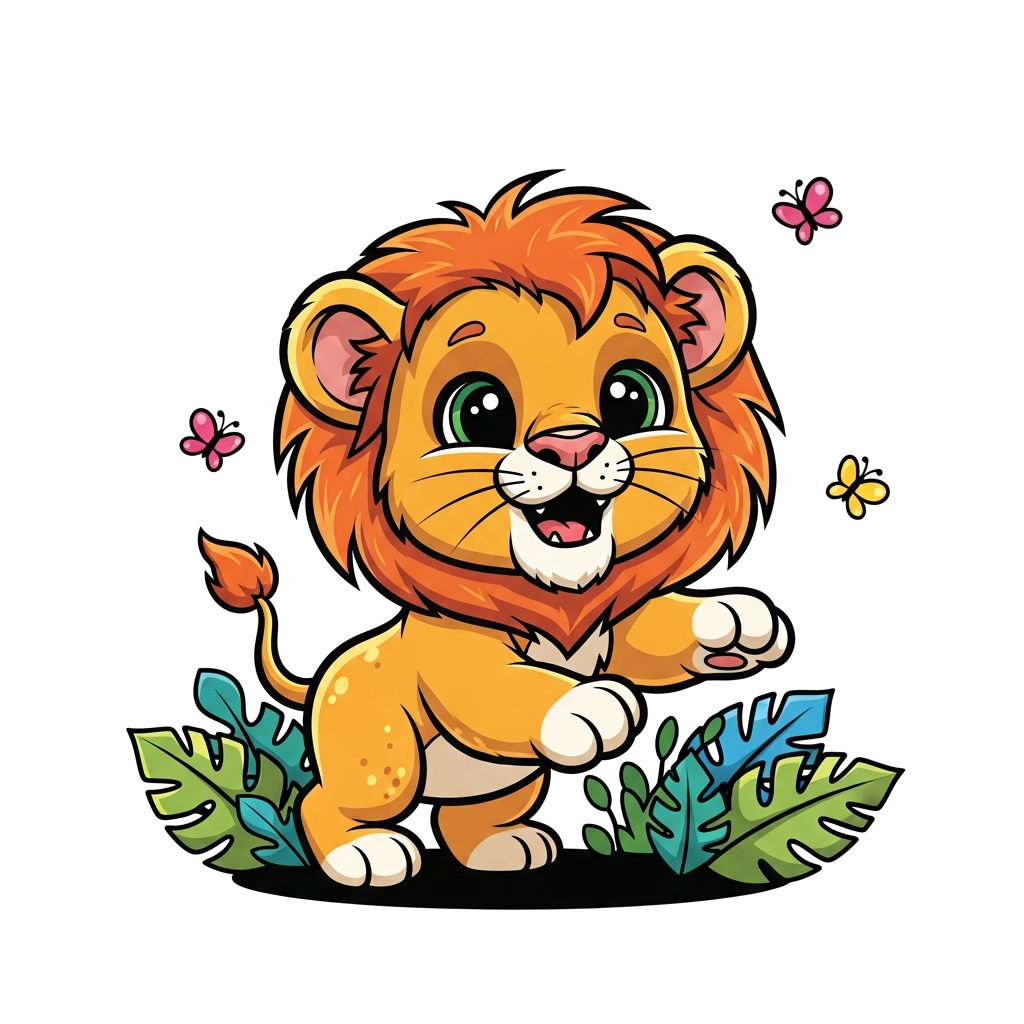 "A super cute, friendly cartoon baby lion cub with big eyes and a fluffy mane, playfully pouncing, surrounded by colorful jungle leaves and tiny butterflies, vibrant and cheerful illustration style."