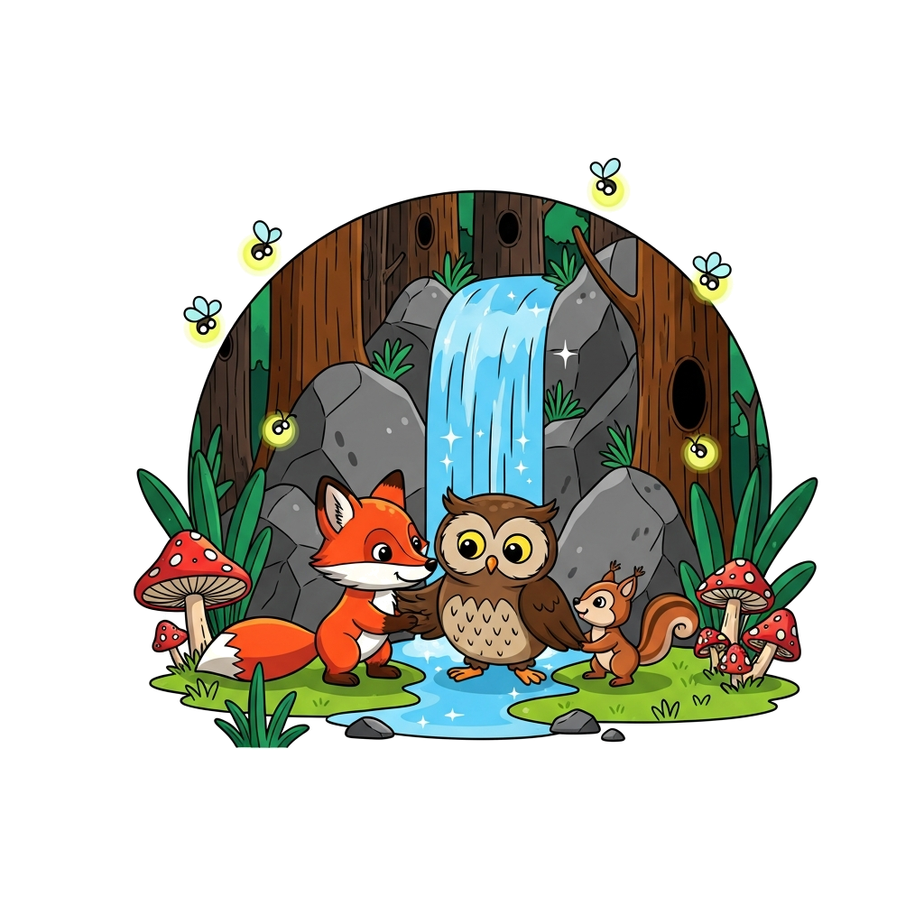 "An enchanted forest scene with a curious fox, a wise owl, and a tiny squirrel playing together near a sparkling waterfall, surrounded by glow-in-the-dark mushrooms and fireflies, whimsical illustration style."