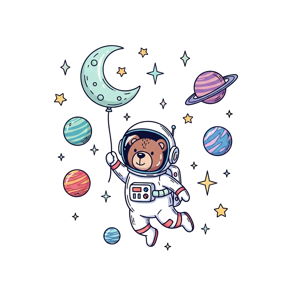 "A whimsical space scene with a friendly astronaut bear floating amongst twinkling stars and colorful planets, holding a balloon shaped like a crescent moon, in a dreamy, pastel-colored cartoon style."