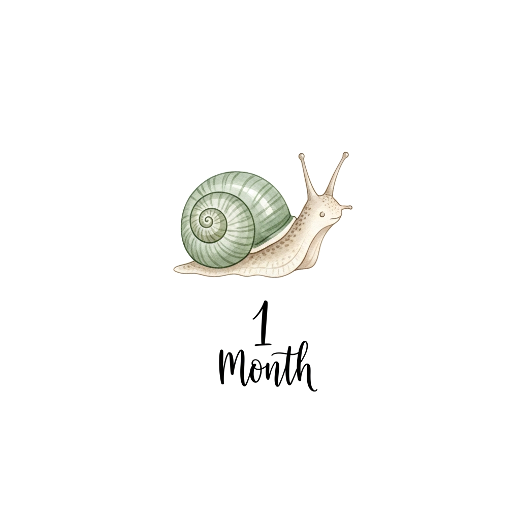 "A minimalist watercolor illustration of a tiny snail with a soft sage green shell. Centered on a white background. Below the snail, elegant hand-lettered text reads '1 Month'. Scandi-style, nursery art aesthetic."