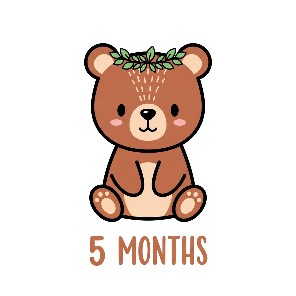 "A minimalist watercolor illustration of a cute brown bear cub wearing a small green leaf crown. Centered on a white background. Hand-lettered text '5 Months' underneath. Warm, earthy pastel tones."