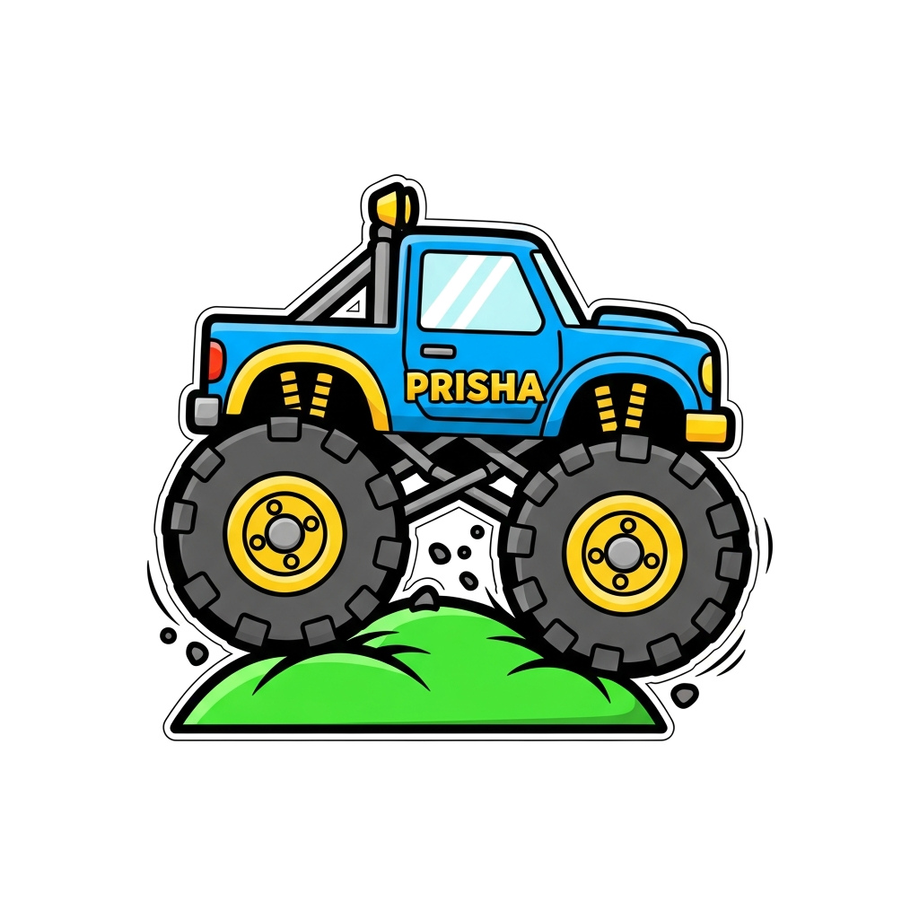 "A cool, stylized monster truck with oversized wheels crushing a small hill, in a dynamic, bold graphic style with vibrant colors, text 'Prisha' incorporated subtly into the design."