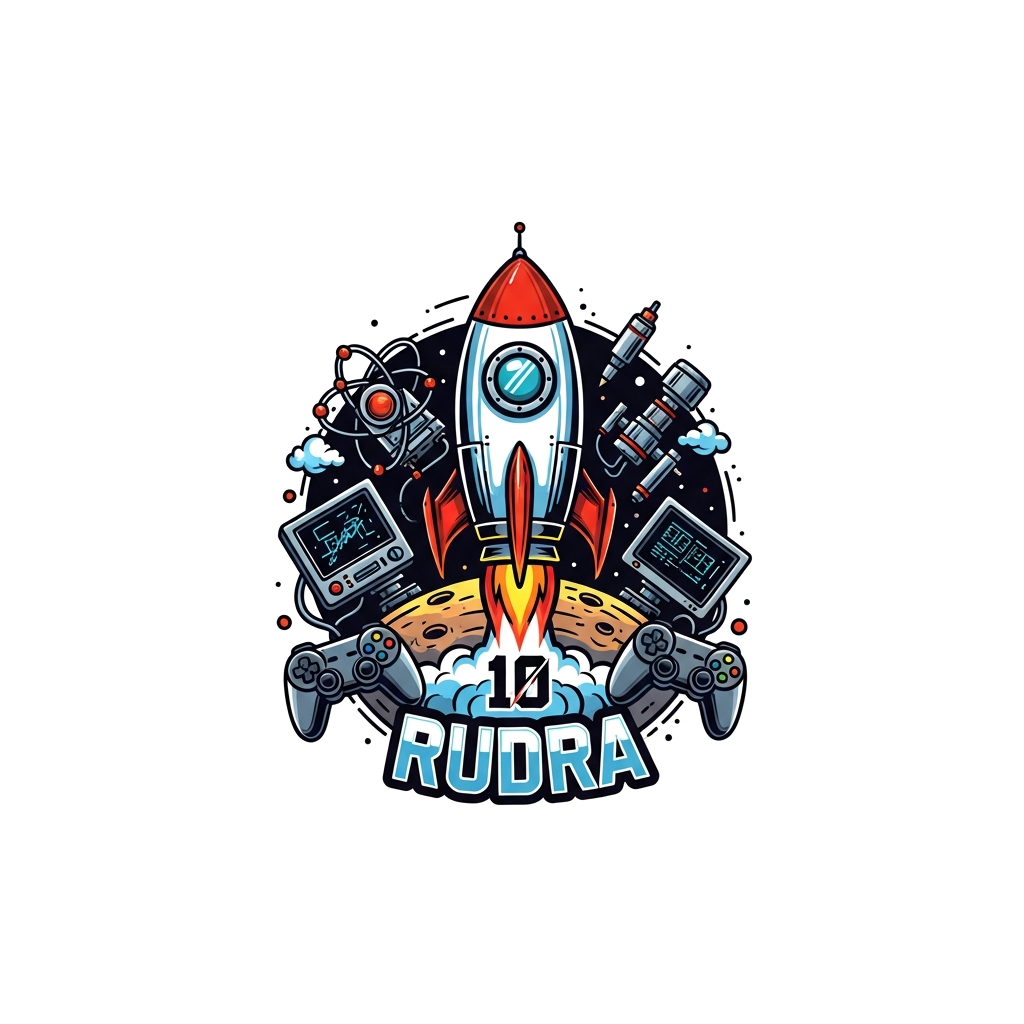 "A dynamic illustration featuring a stylized rocket blasting off from a planetary surface, surrounded by scientific instruments and gaming controllers. The number '10' is subtly incorporated into the rocket's exhaust, and 'Rudra' is written in a strong, tech-inspired font."