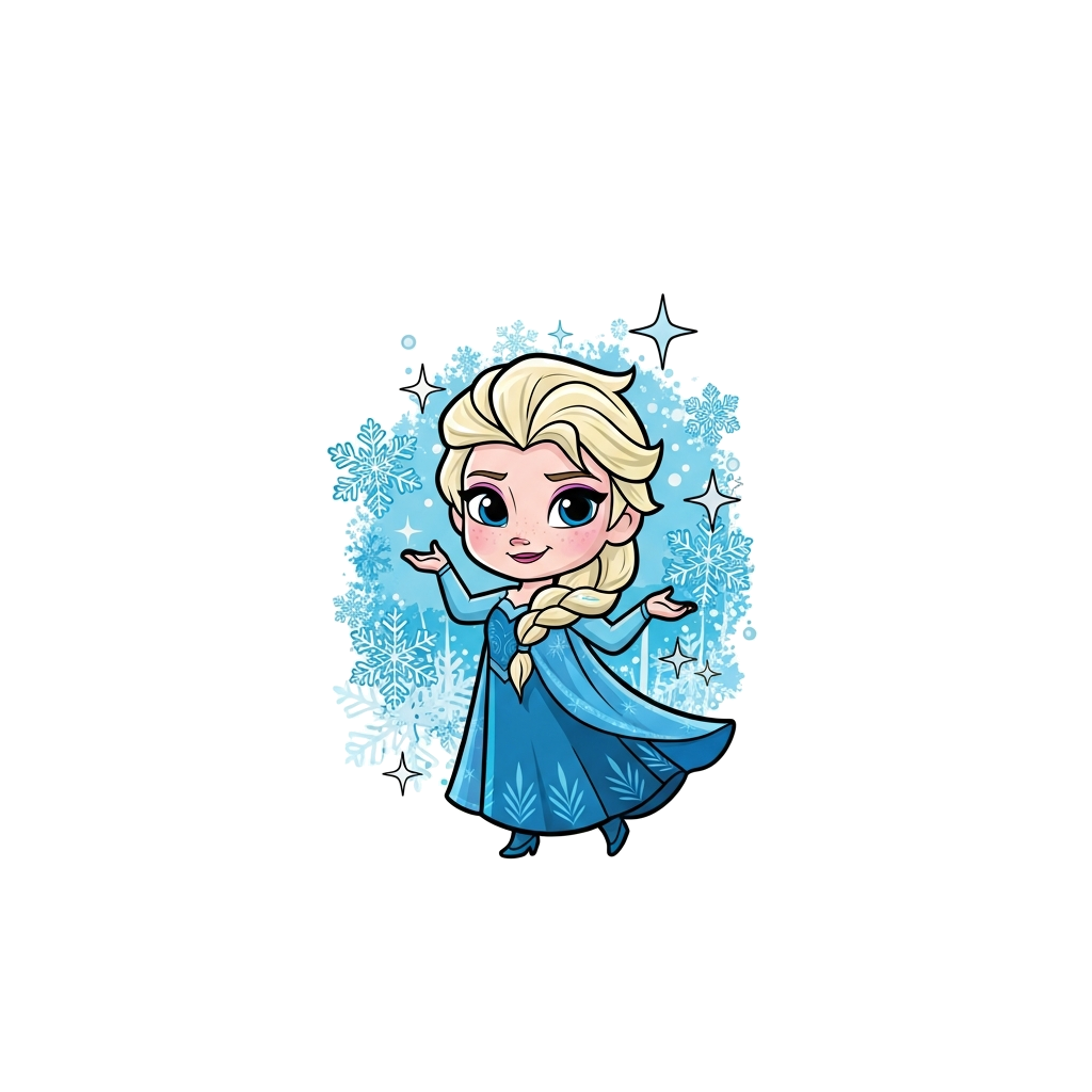 "A cute, cartoonish Elsa character in a playful pose, surrounded by sparkling snowflakes and a frosty, whimsical background, in a vibrant, child-friendly illustration style."