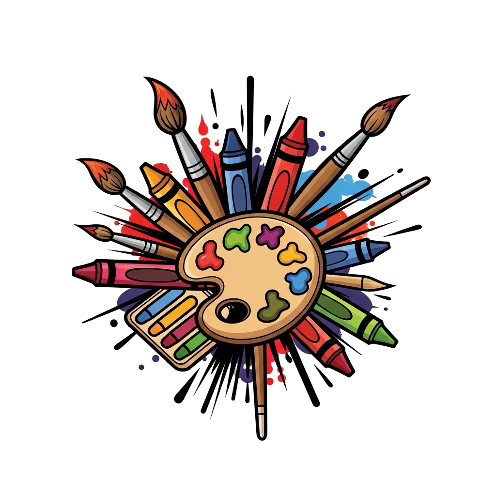 "A dynamic illustration of various art supplies like paintbrushes, crayons, and a palette, arranged in a cool, graffiti-inspired style with splashes of bold red and black outlines, vibrant and energetic."