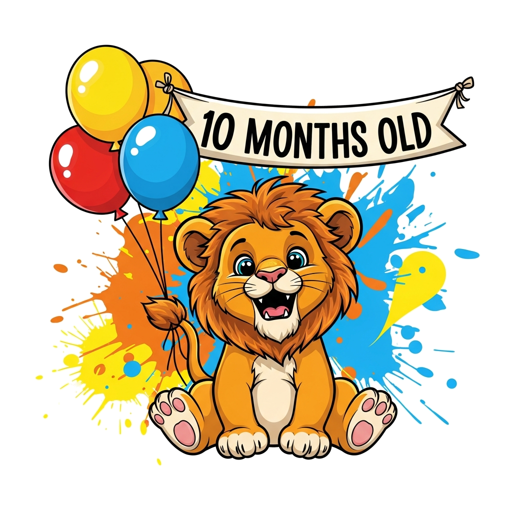 "A cheerful baby lion cub illustration, sitting playfully with colorful balloons and a banner that says '10 Months Old', set against a vibrant background with splashes of bright yellow, orange, and blue. Cartoon style, very cute and friendly."