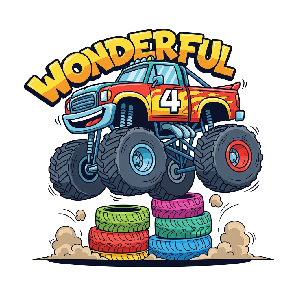 "A bold and cool cartoon monster truck jumping over a pile of colorful tires, with the number 4 prominently displayed, and the word 'Wonderful' incorporated into the scene, vibrant colors, dynamic action shot."
