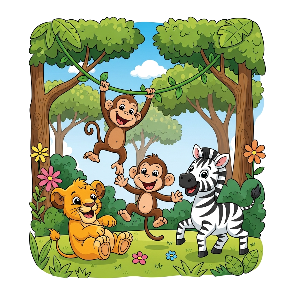 "A group of cheerful baby jungle animals (lion cub, monkey, zebra) playing together in a lush, vibrant forest, cartoon style with bright colors and a friendly atmosphere."