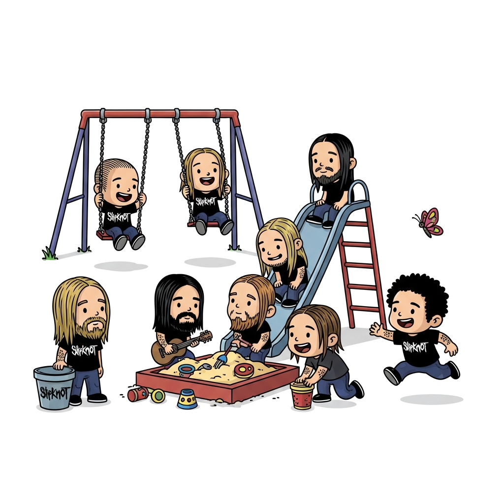 "Slipknot members playing in a park as if they were kids ( their childhood)"