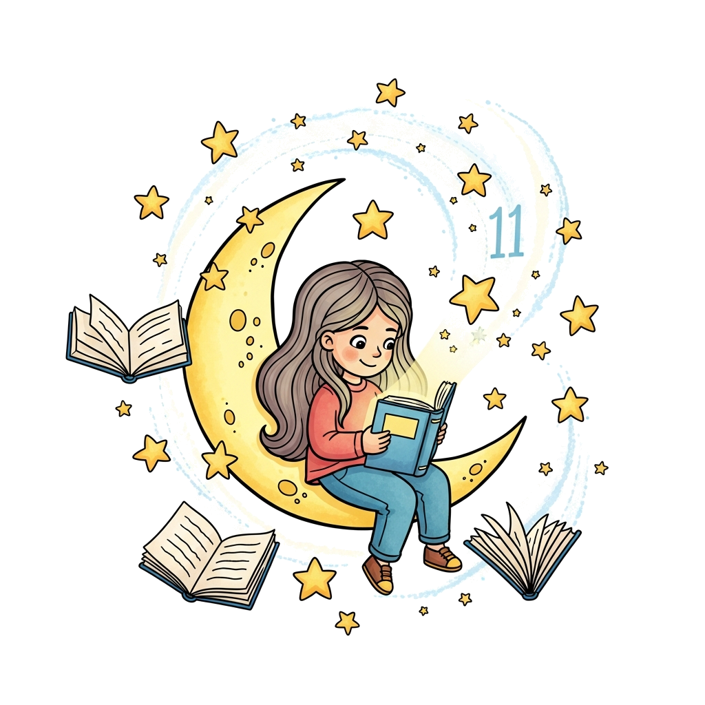 "A whimsical illustration of a young girl with long flowing hair, happily reading a glowing book while sitting on a crescent moon, surrounded by floating stars, open storybooks, and gentle, swirling magical dust, in a soft pastel watercolor style with a subtle '11' integrated into the stardust."