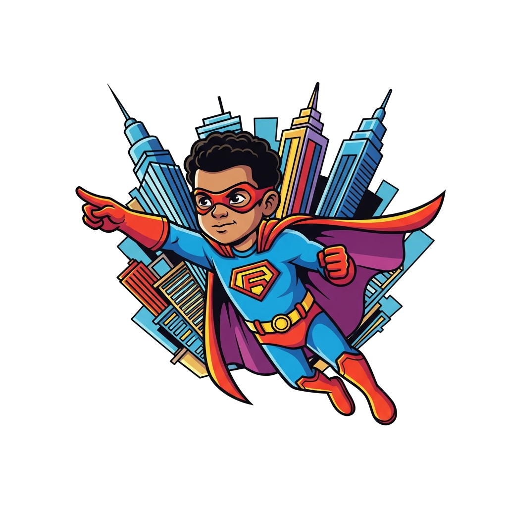 "A bold and cool cartoon illustration of a diverse superhero kid soaring through a vibrant, stylized city skyline, dynamic pose, strong lines, comic book style, bright and energetic colors, isolated graphic."
