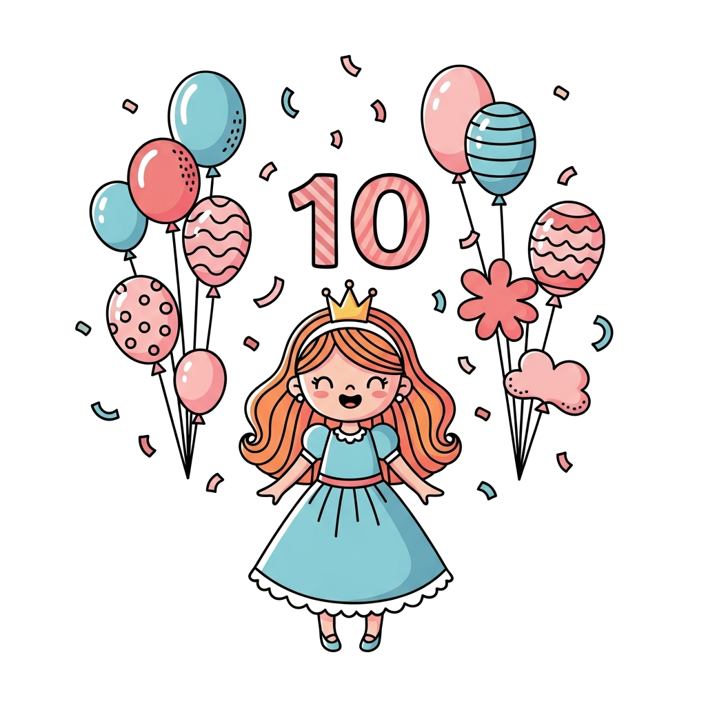 "A cute cartoon princess celebrating her 10th birthday, surrounded by balloons and confetti, in a whimsical, pastel color palette. She has a joyful expression and a small crown."