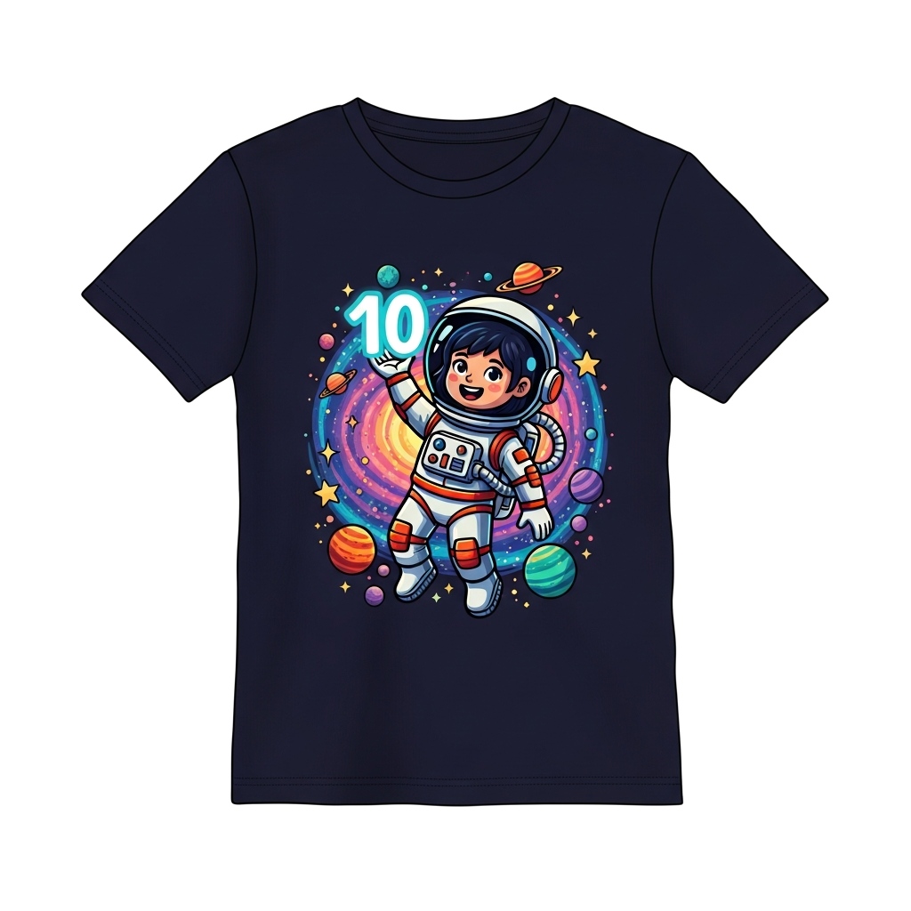 "A cheerful cartoon girl astronaut floating in a vibrant galaxy, surrounded by colorful planets, twinkling stars, and cosmic dust, playfully holding up a glowing number '10', in a whimsical, detailed illustration style."