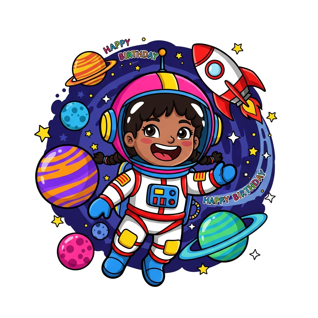"A cheerful, diverse young girl astronaut named Mithra, age 10, floating happily in a vibrant space scene, surrounded by colorful planets, twinkling stars, and a rocket. Dynamic, cartoonish, and super colorful, with 'Happy Birthday' subtly integrated."