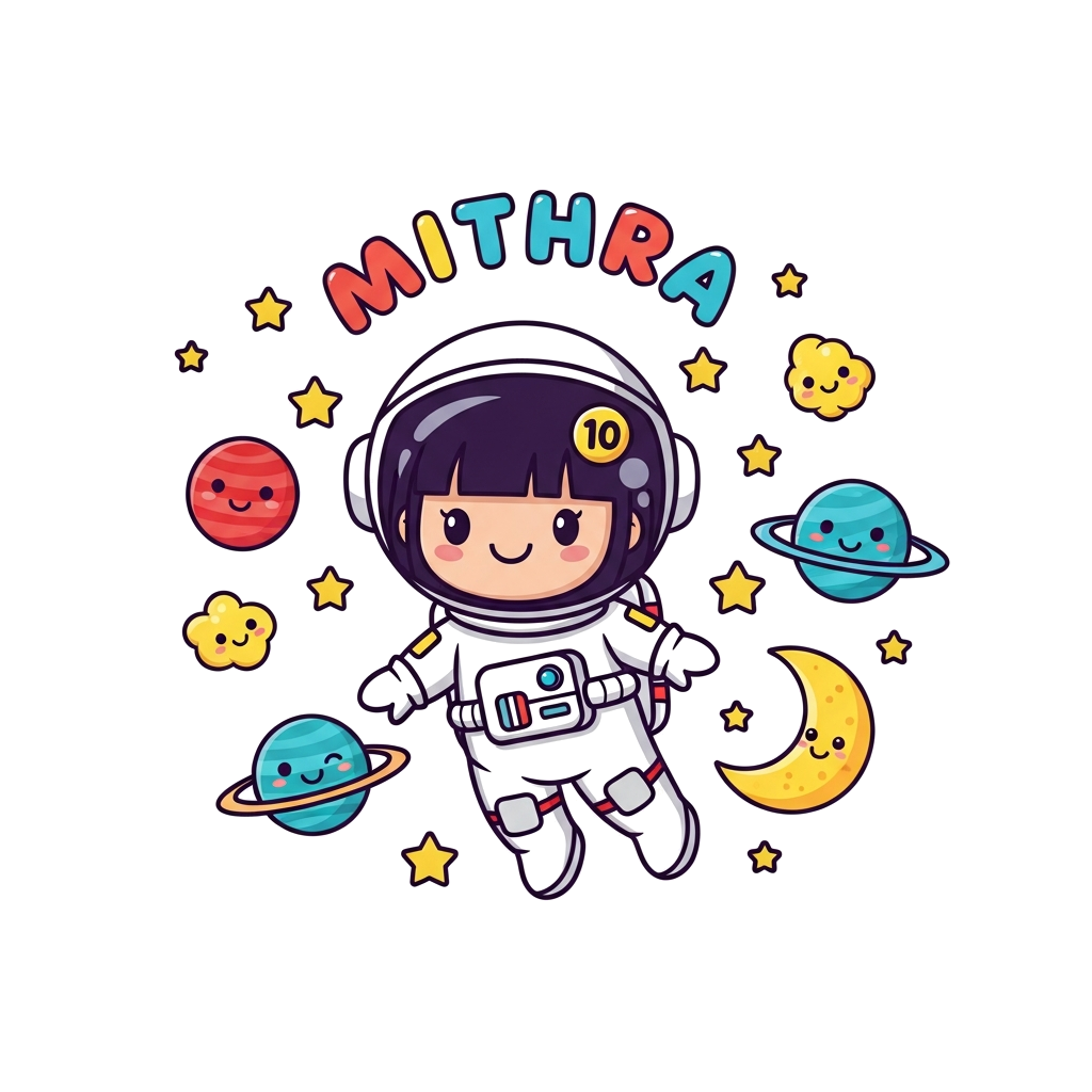 "A cute cartoon girl astronaut (Mithra) with a friendly smile, floating in a vibrant outer space scene. She is surrounded by whimsical, smiling planets, twinkling stars, and a crescent moon. A small, stylized '10' is visible on her space helmet. The name 'Mithra' is written in playful, starry letters around her. Bright, cheerful colors, kawaii style."