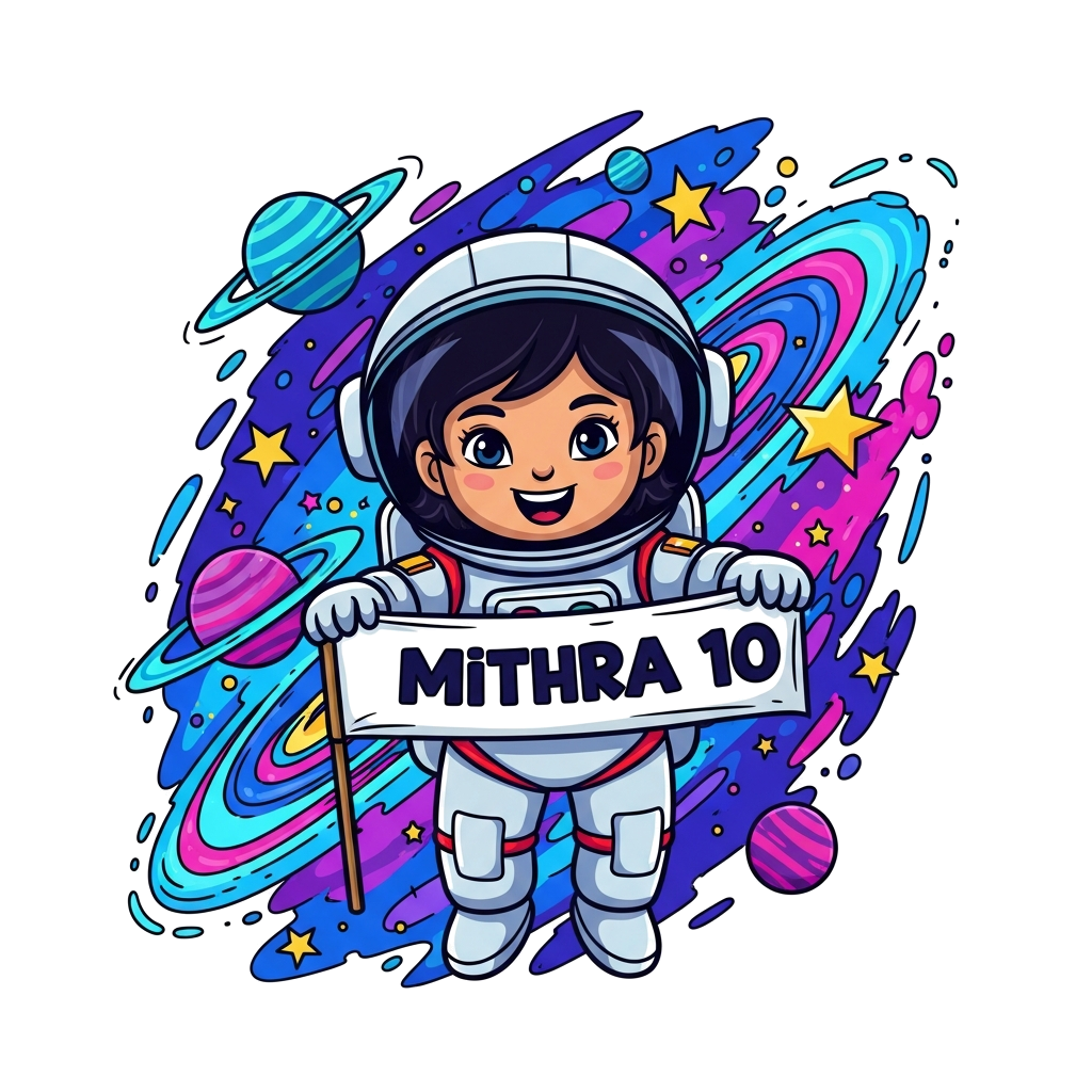 "A vibrant, colorful space scene with a friendly astronaut girl (Mithra) floating among planets, stars, and nebulae, holding a banner that says 'Mithra 10'. The style is bold and energetic, with bright blues, purples, and pinks."
