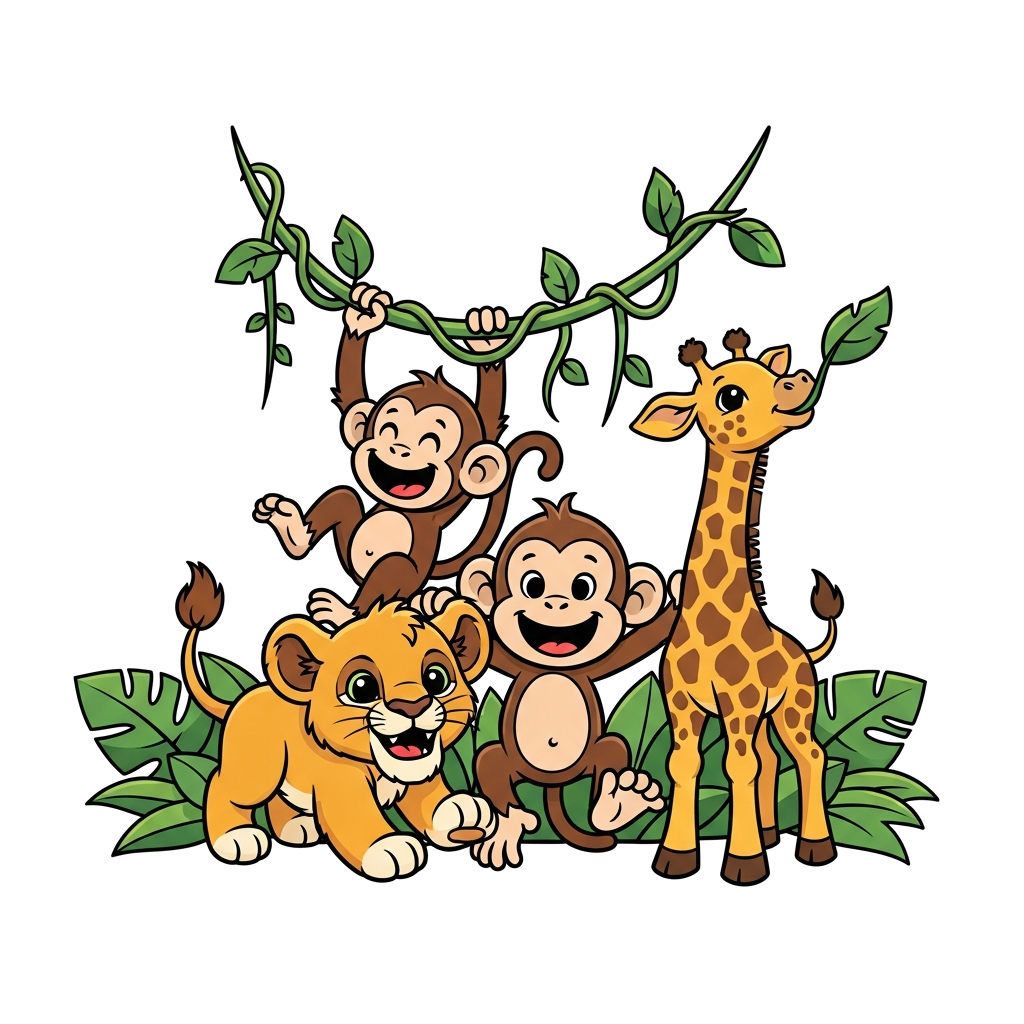 "A group of cute, friendly jungle animals (like a baby lion, monkey, and giraffe) playing happily among lush green leaves, in a vibrant and playful cartoon style with bright colors."