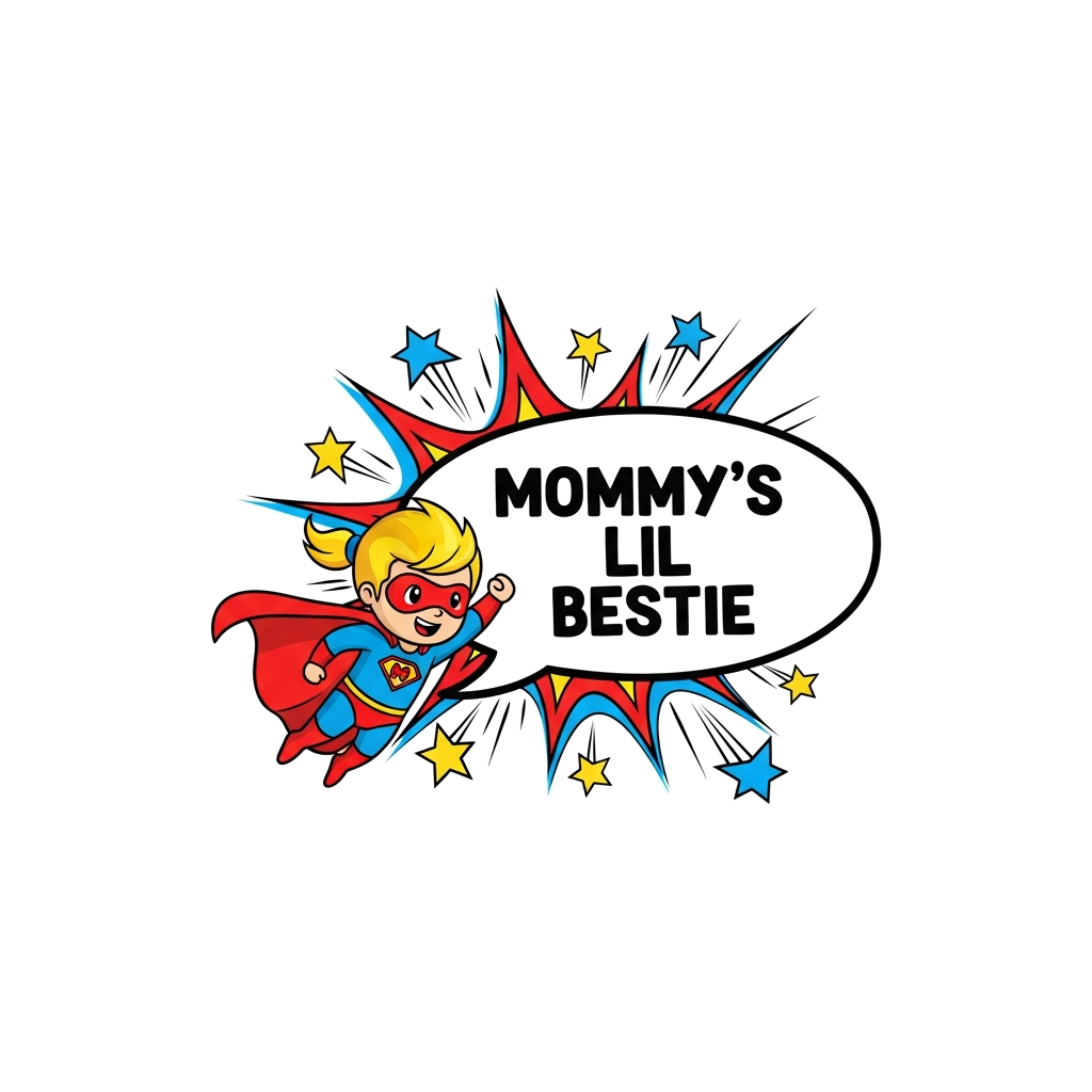 "A cute cartoon superhero character (gender-neutral) flying with a cape, in a dynamic pose, with a speech bubble or banner proudly displaying "Mommy's Lil Bestie" in a fun, bold font. The background features comic book style action lines and stars in bright reds, blues, and yellows."