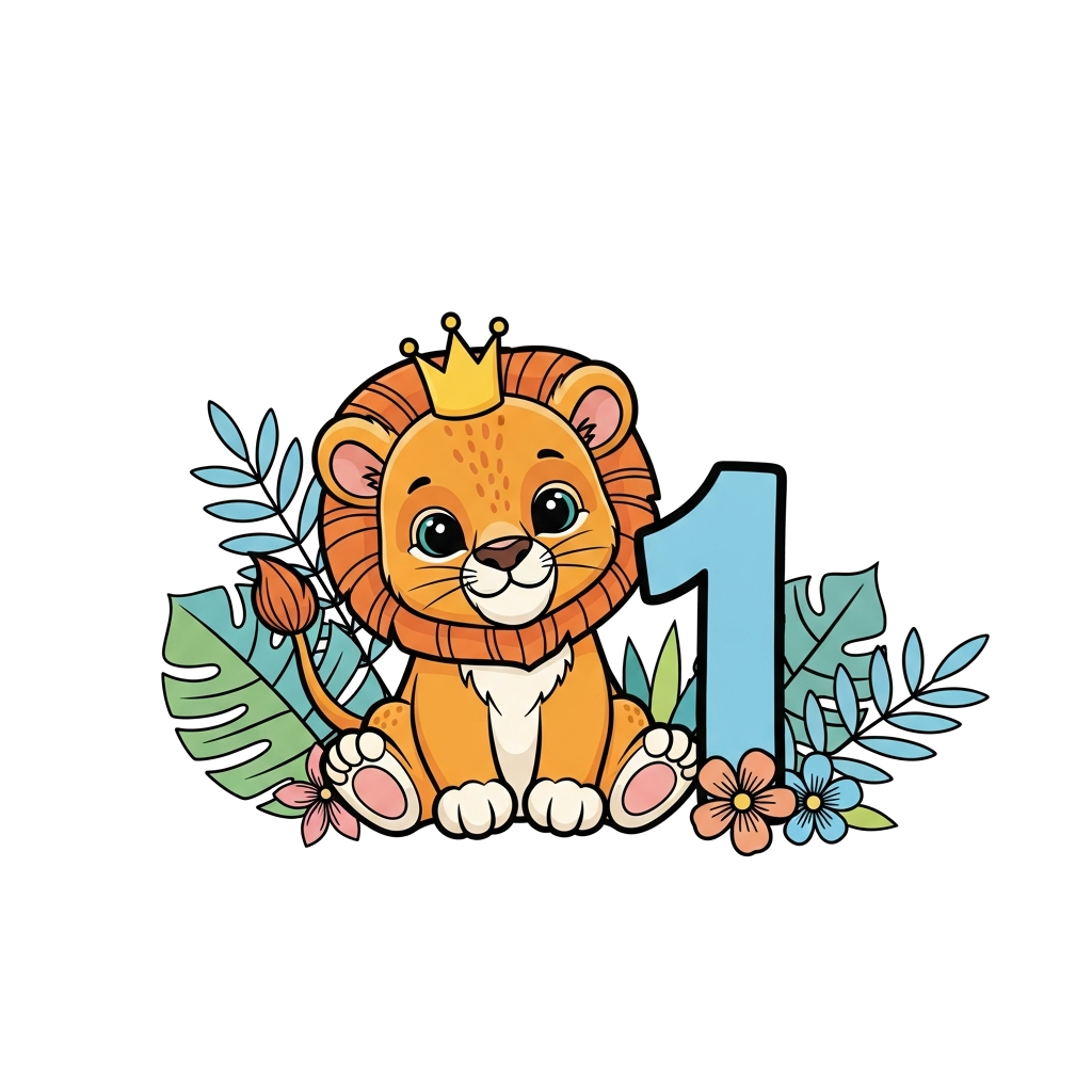 "A super cute, friendly baby lion cub wearing a tiny crown, sitting among colorful jungle leaves and flowers, with a big '1' beside it, in a playful cartoon style with soft outlines."