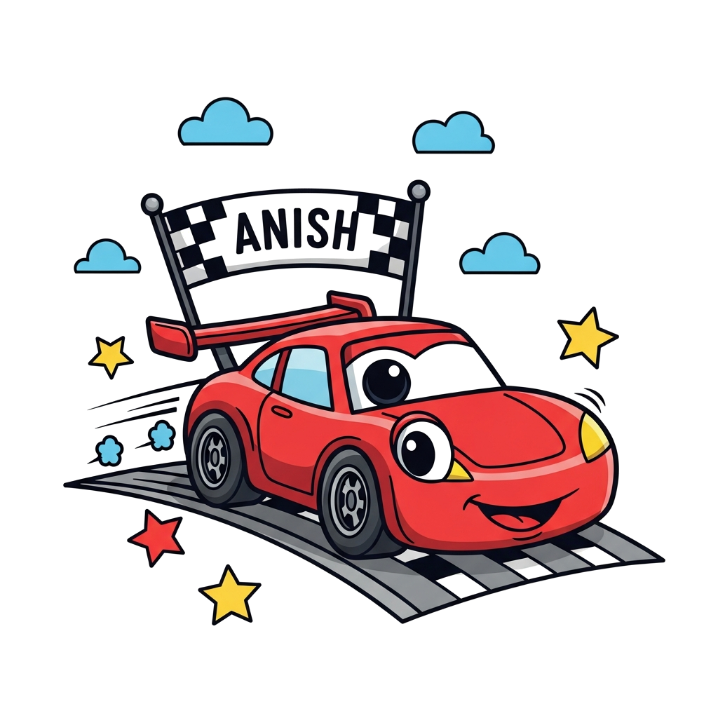"A charming cartoon illustration of a friendly red race car with big eyes and a smile, zooming on a track with a checkered flag banner that says 'Anish', surrounded by playful stars and simple clouds, vibrant colors, clean lines."