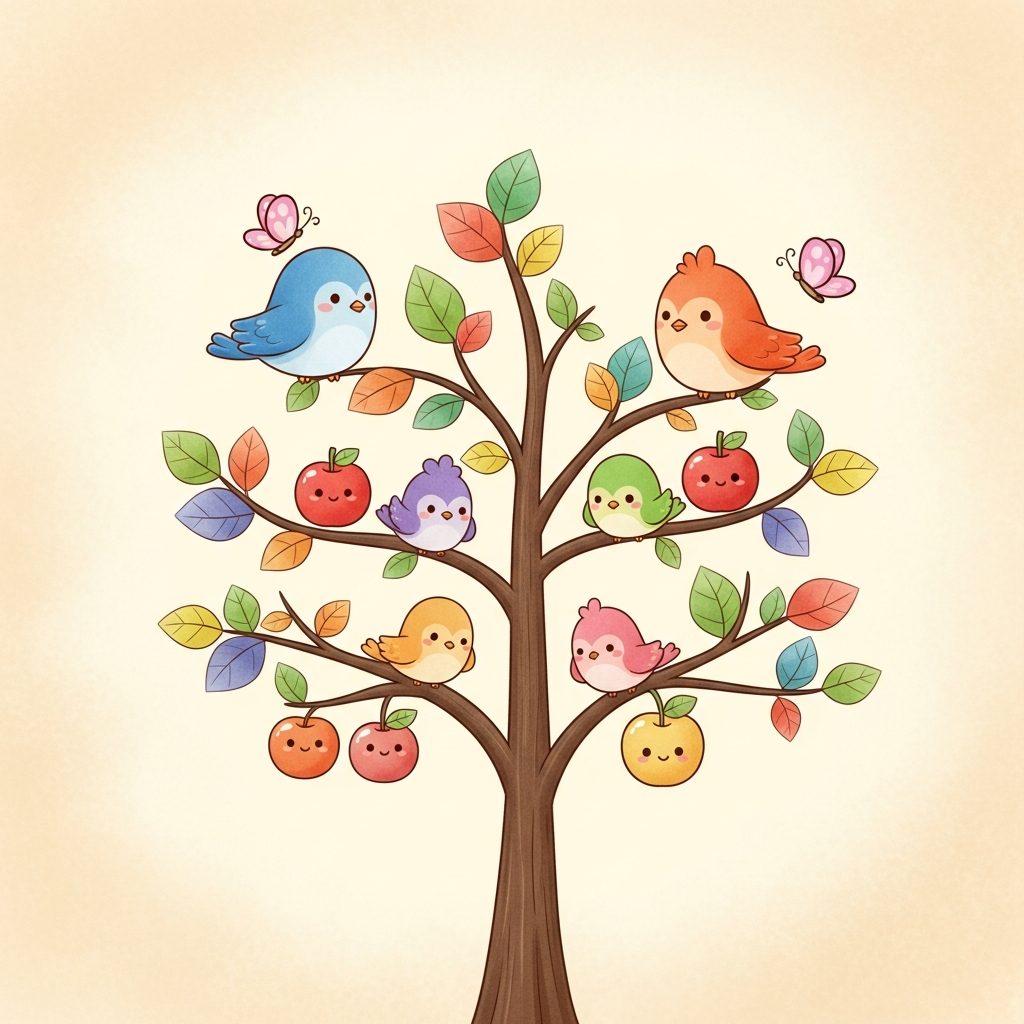 "An adorable illustration of a stylized "family tree" with cartoon birds and butterflies perched on branches, with colorful leaves and small, cute fruits representing family members, set against a soft, warm background, in a charming and gentle watercolor cartoon style."