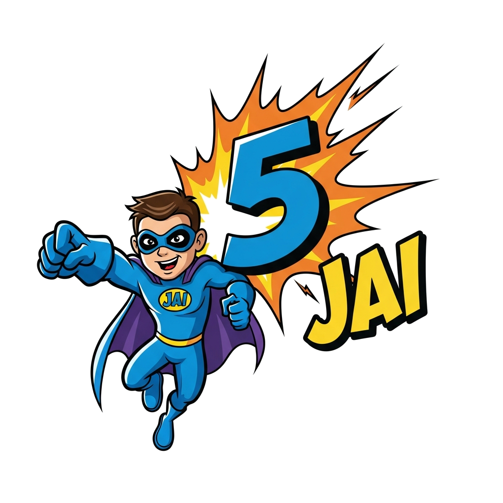 "A dynamic, bold cartoon illustration of a superhero character with a cool mask, leaping into action. The number '5' is integrated into a powerful energy blast behind them, with 'Jai' written in a strong, comic-book style font. Vibrant colors and sharp lines."