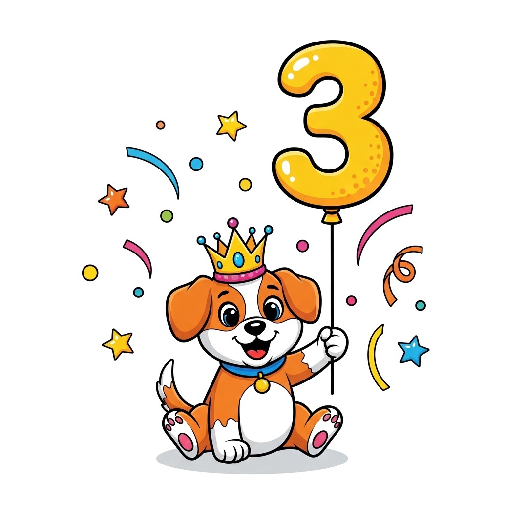 "A vibrant cartoon illustration of a playful puppy wearing a sparkly princess crown, holding a large, cheerful number '3' balloon, surrounded by confetti and playful stars, in a bold and colorful style."