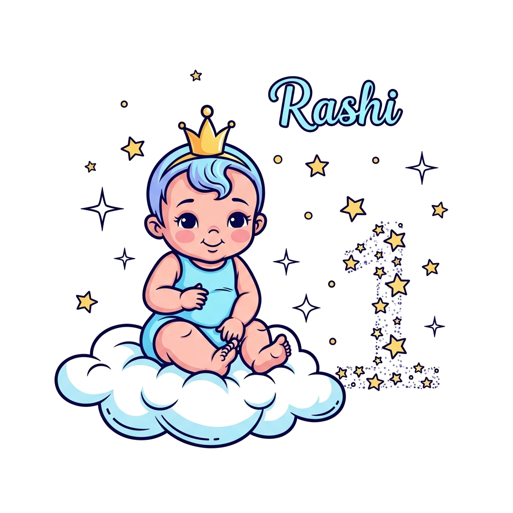 "A whimsical illustration of a baby princess Rashi, with soft, dreamy pastel colors, sitting on a cloud with a tiny golden crown, surrounded by sparkling stars and a gentle '1' made of stardust."