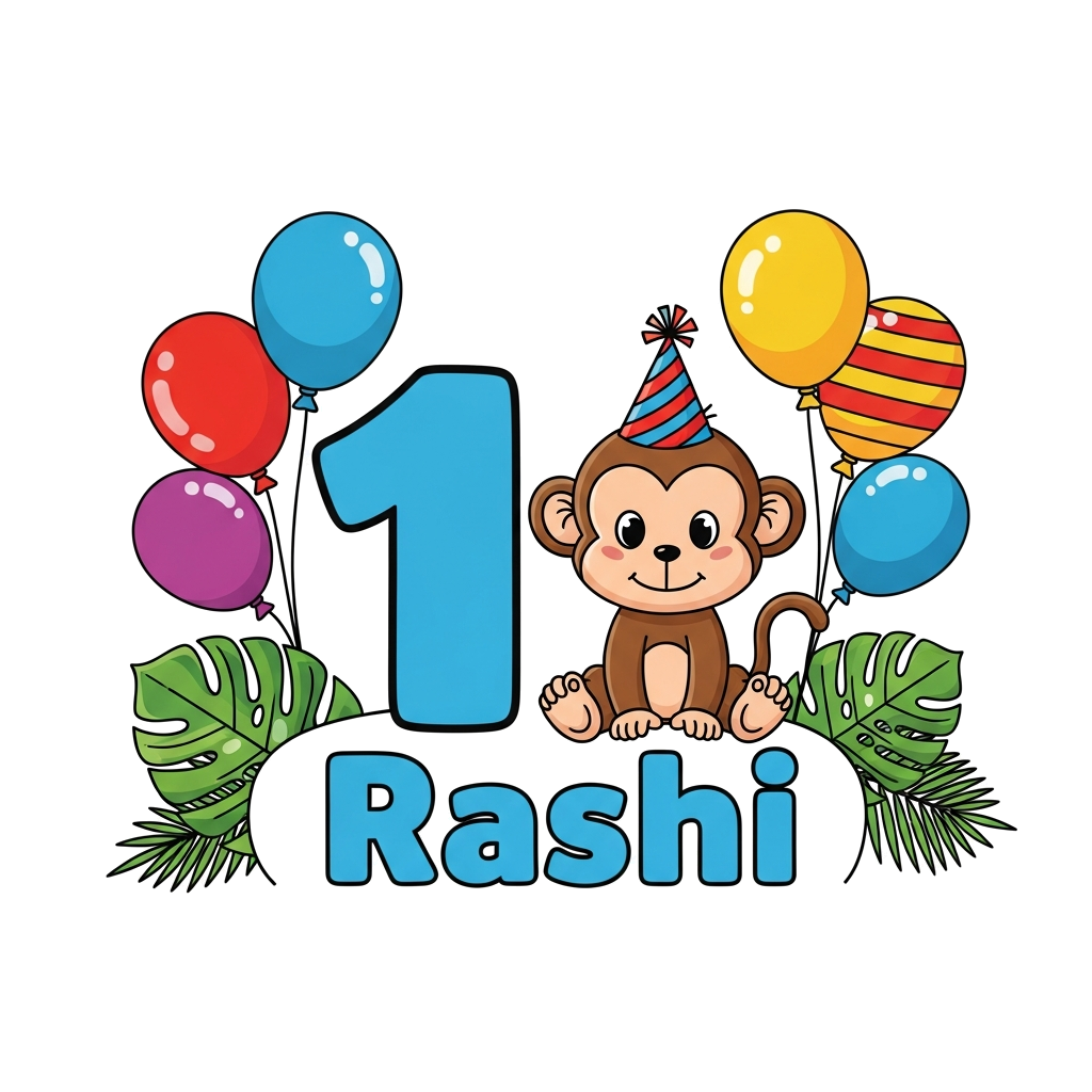 "A super cute cartoon baby monkey wearing a tiny party hat, sitting next to a big number '1' with 'Rashi' written playfully below, surrounded by colorful balloons and jungle leaves, in a vibrant, friendly style."