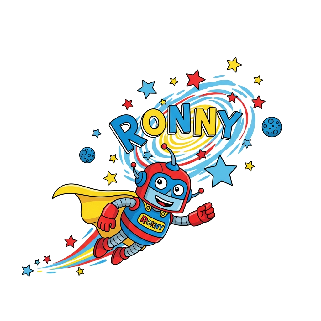 "A vibrant cartoon illustration of a friendly superhero robot flying through a colorful starry galaxy, with 'Ronny' written playfully amongst the stars, in a dynamic and energetic style."