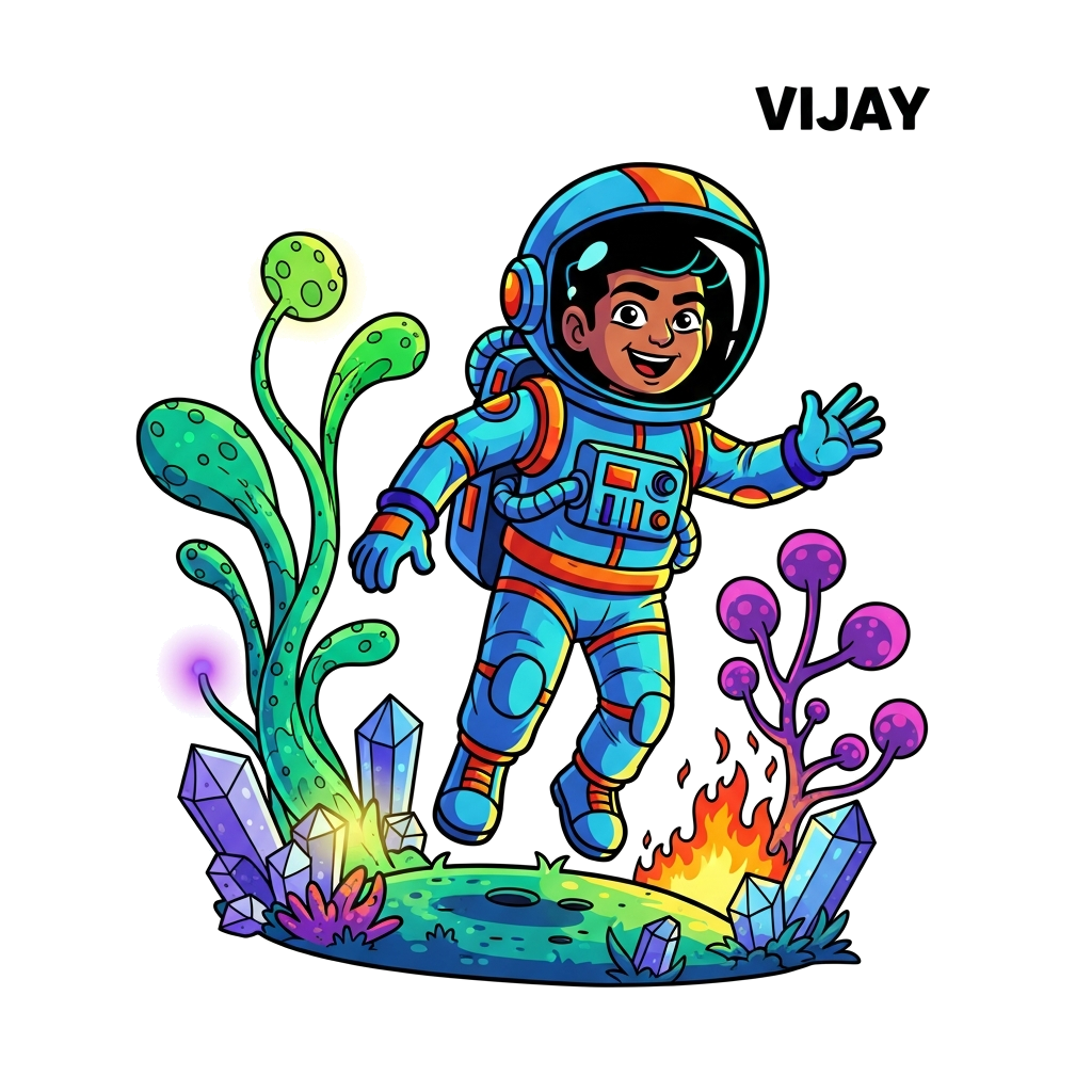 "A fearless cartoon astronaut named Vijay exploring a vibrant alien planet with unusual flora and glowing crystals, bold lines, dynamic composition, bright cosmic colors, adventurous art style."