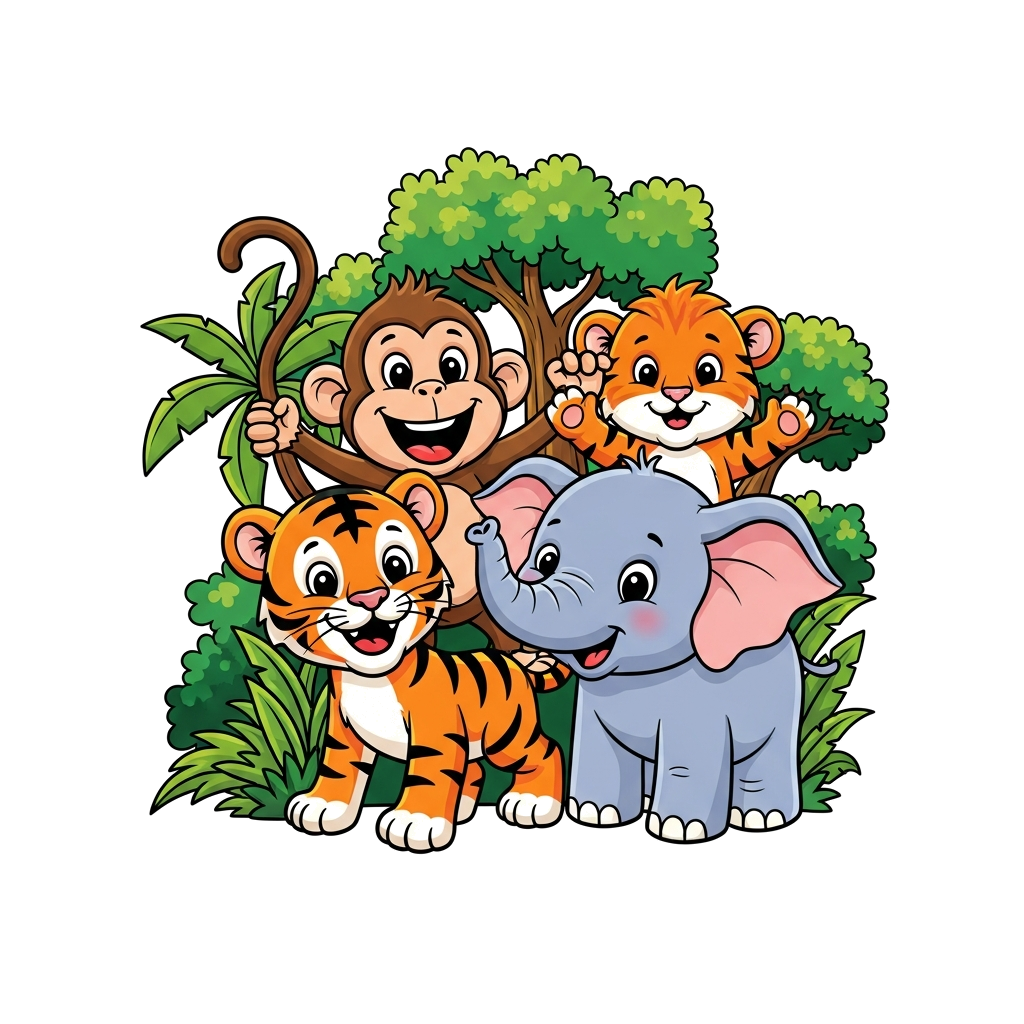 "A cheerful group of cartoon jungle animals (a grinning monkey, a happy tiger cub, a cute elephant calf) playing together in a vibrant, lush green forest, bright and friendly illustration style."