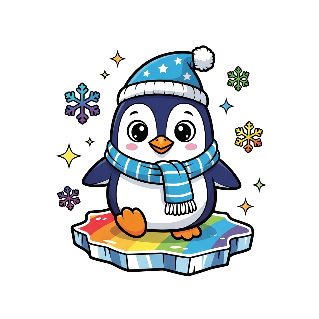 "A cheerful cartoon penguin with big friendly eyes, standing on a rainbow-colored ice floe, surrounded by sparkling rainbow-hued snowflakes and stars, in a vibrant and playful style."