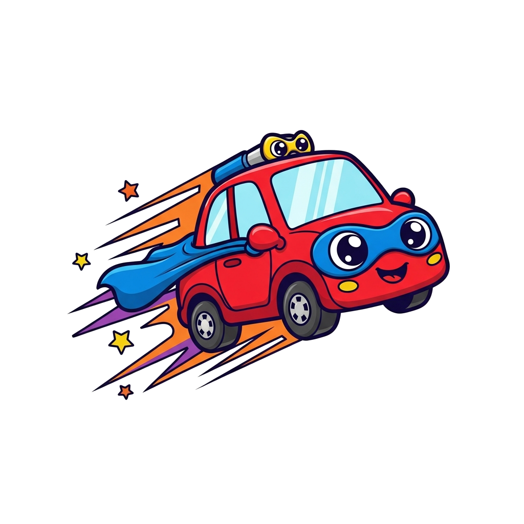 "A super cute cartoon little red car with big friendly eyes, wearing a blue superhero cape and a tiny yellow mask, flying through a starry sky with orange and purple comic-style speed lines, in a playful, vibrant cartoon style."