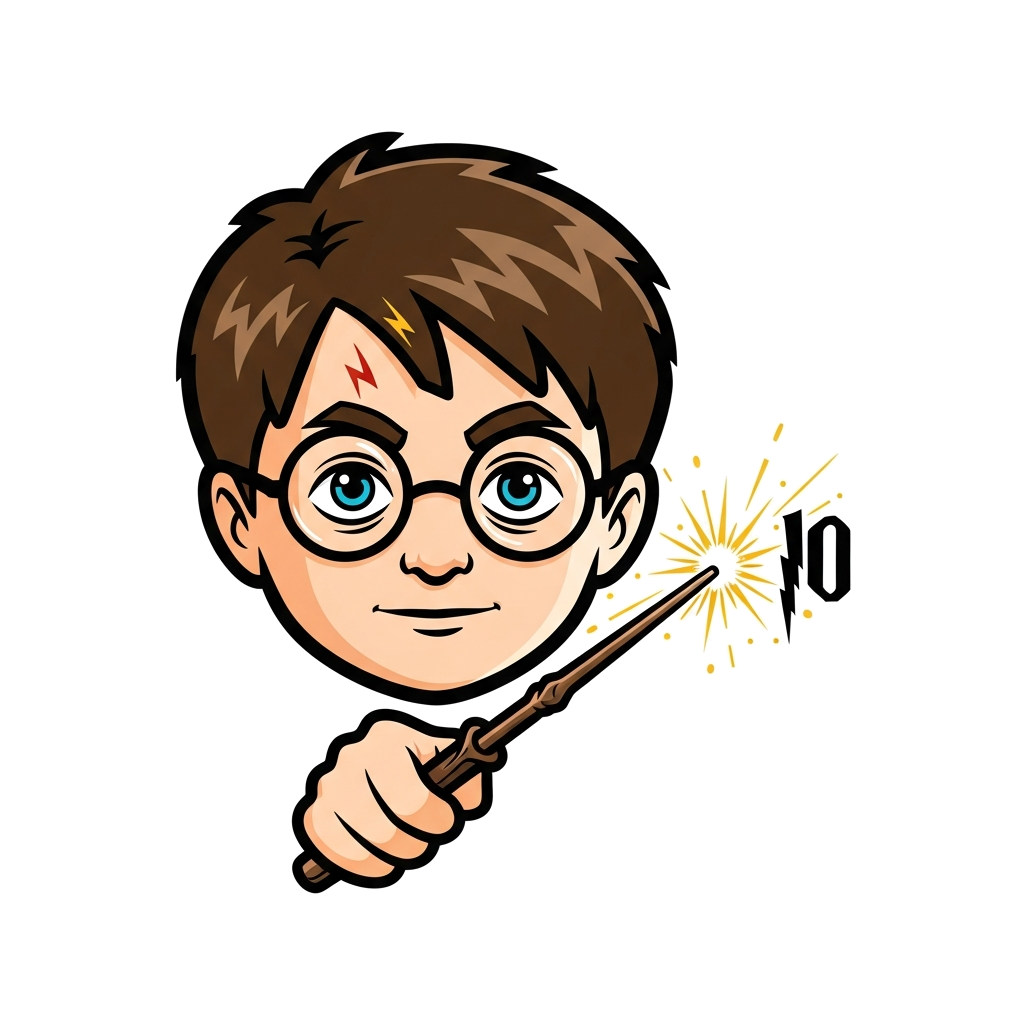 "A cool illustration of Harry Potter's face with his iconic glasses and scar, holding his wand mid-spell, with magical sparks and a subtle '10' integrated into the design, vibrant and detailed fantasy art style."