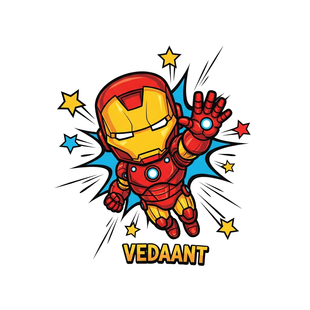 "A dynamic cartoon illustration of a cute, friendly Iron Man flying with one arm extended, surrounded by stylized comic book action lines and stars, with the name 'Vedaant' subtly integrated below, vibrant and bold colors."