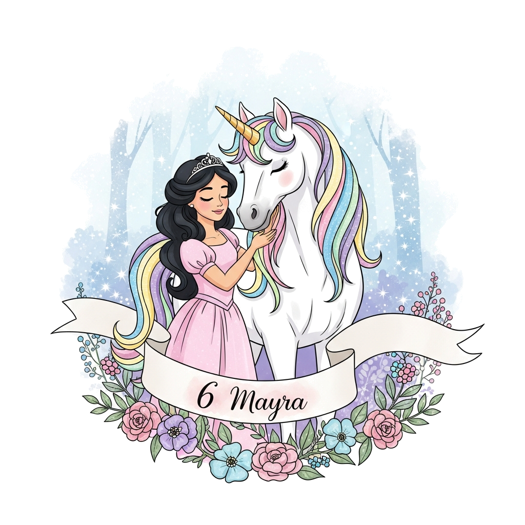 "An elegant and dreamy illustration of a beautiful princess, resembling Mayra, gently petting a majestic white unicorn with a shimmering mane and tail. The scene is set in a soft, magical forest with sparkling dust and pastel flowers. The number '6' and 'Mayra' are subtly integrated into the design, perhaps on a delicate banner or as glowing elements, in a watercolor style."